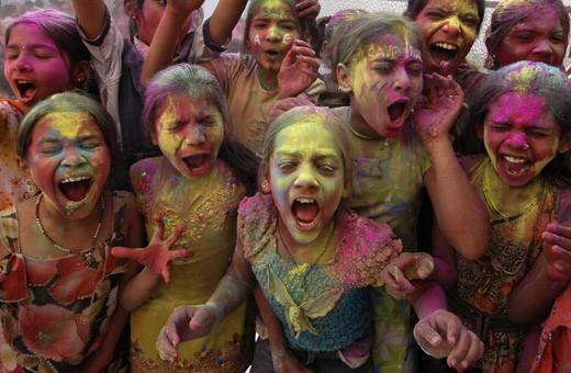 3月9日,印度加尔各答,人们在欢庆一年一度的传统节日“Holi”节,这个节日是印度最盛大的节日之一,源于古人期盼丰收的活动,在每年2月至3月间举行。节日里最有趣的庆祝方式式就是涂抹色彩了,人们会用手或类似水枪的工具把各种色彩的颜料涂在别人身上表示祝福,因此中文还把这个节日翻译成洒红节。