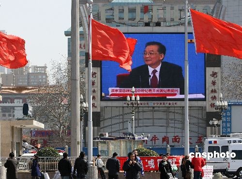 2009年3月13日,国务院总理温家宝在人民大会堂与采访全国两会的中外记者见面,北京站站前大屏幕对此进行实况转播,吸引往来旅客的关注。中新社发 鲁谷 摄