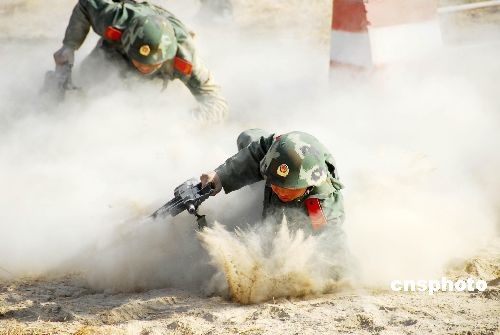2009年3月16日,驻守新疆塔克拉玛干沙漠腹地武警和田五支队二中队官兵在进行战术训练。塔克拉玛干沙漠环境恶劣,但武警官兵们没有被艰苦环境消磨斗志,他们吃苦不言苦,用超强度的技战训练锻炼坚强意志,成为驻地维稳处突的“轻骑兵”。中新社发 周密 摄