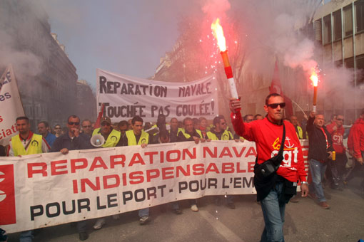 3月19日法国各大工会在全国各地联合组织罢工和示威游行等活动,抗议萨科齐政府在应对当前经济危机过程中忽视劳动者权益和社会福利。图为法国城市马赛举行罢工游行。
