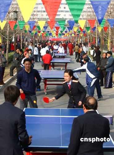 3月20日,北京市东城区第三届“和谐杯”乒乓球赛在地坛公园开幕,来自社会各行业的选手参加了此次赛事。中新社发 富田 摄
