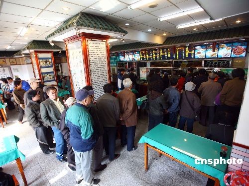 3月20日,迎来24节气中的“春分”,意思是说春天过了一半。按照老北京的习俗,“春分吃豆面糕(驴打滚),避邪祈福”。北京著名护国寺小吃连锁店为这天的到来准备了1万多个驴打滚。图为在护国寺小吃店了排队买驴打滚的民众。中新社发 富田 摄