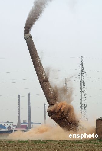 2009年3月20日,河北省沙河市组织实施第七次烟囱集中爆破。当日,位于沙河市区北端107国道两侧的云达、洪恩、普光等15家玻璃厂的15根烟囱被爆破拆除。截止目前,沙河市共集中爆破拆除烟囱148根。中新社发 克家 摄