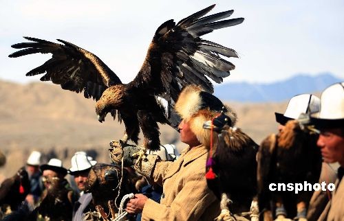 3月20日,位于新疆西部天山南脉腹地的阿合奇县举办第二届猎鹰节,当地柯尔克孜族民众聚集在该县赛马场,展示自家驯养的上百只猎鹰。当地柯尔克孜族驯养猎鹰有着悠久的历史,至今仍完整保留着原始的驯养方式,被誉为中国“猎鹰之乡”,当地柯尔克孜族也被誉为“鹰王”。他们在放牧的同时,经常骑马到高达近百米的高山顶上,将自己驯养的猎鹰放飞。中新社发 刘新 摄