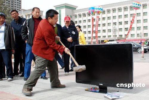 3月22日中午,在新疆库尔勒市的中心广场上,一名市民扬起榔头对着一台崭新的47英寸飞利浦液晶彩电砸去,这台电视瞬间变得七零八落。当事人称,这台电视刚买一个多月就出现故障,一直得不到售后服务,出此下策。中新社发 汪涛 摄