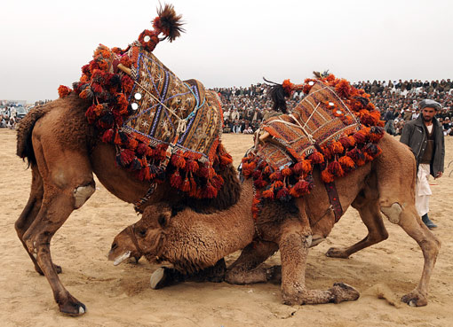 3月23日,阿富汗马扎里沙里夫,在当地举行的斗骆驼活动中,两匹骆驼在进行打斗。斗驼与斗狗、斗羊和马背叼羊比赛一样是阿富汗民众在阿历新年前后的重要庆祝活动。