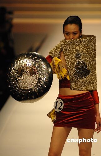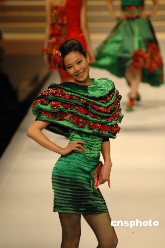 3月24日,中国国际时装周(09/10秋冬季系列)在北京隆重开幕。来自18个国家的31位青年设计师在“汉帛奖”上的角逐,今年第17届的“汉帛奖”大赛主题为“国庆招待会”。中新社发 樊建恩 摄
