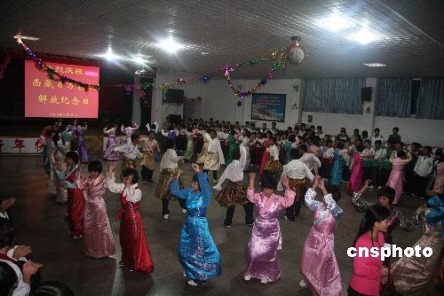 3月28日,福建三明列东中学藏族师生与驻地部队官兵、公安民警以及其他各界群众载歌载舞庆祝农奴解放日。中新社发 卢立杰 摄