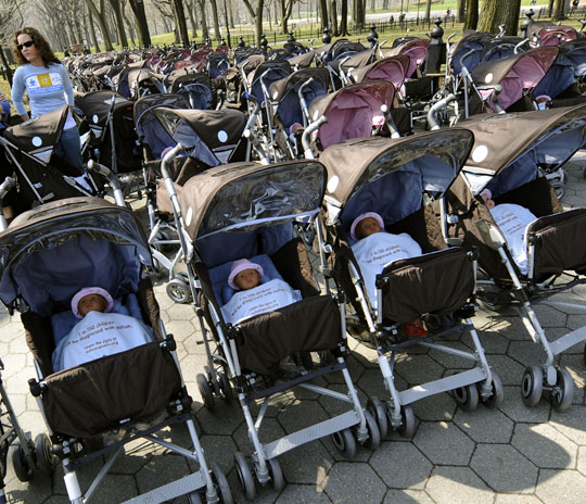 2009年4月2日是第2个世界自闭症日,美国纽约街头150个宝宝玩偶孤独的躺在婴儿车里,呼吁人们对自闭症儿童引起注意。