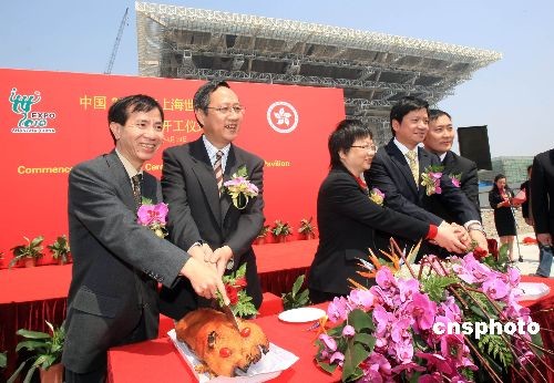4月10日,中国2010年上海世博会香港馆开工仪式在上海世博园区举行。香港馆位于中国馆南面,占地面积约为600平方米,预计建设时间需11个月。中新社发 汤彦俊 摄