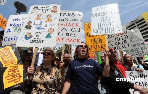 当地时间四月九日,几十名“美国演员工会”(SAG)成员在“美国制片人联盟”(AMPTP)办公楼前举行抗议集会。这些好莱坞基层演员抗议美国制片人联盟提出的新合同内容不公平,指责资方“贪婪无度”,呼吁演员工会启动授权罢工投票。全美最大的演艺人员工会组织“美国演员工会”与好莱坞制片商的新合同谈判几度破裂,演员工会内部也出现了两种声音,有的希望尽快与资方妥协,有的希望发动罢工,向资方施加压力。
