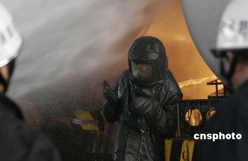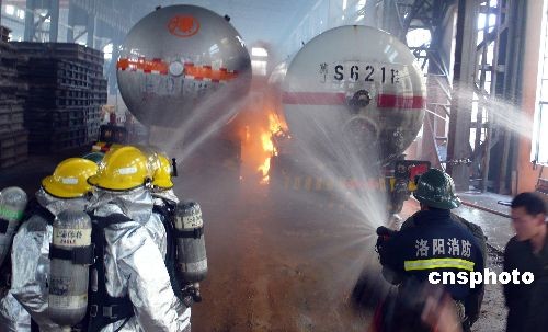 2009年4月13日上午9时许,两辆液化气槽车在位于洛阳市城区北部的红山工业园区洛北铸钢厂内作业时引发气体泄漏燃烧事故,喷出的液化汽火焰在槽车罐体侧部和底部不断燃烧,罐体温度不断升高随时都有爆炸危险,周围数平方公里的生命和财产面临严重威胁。洛阳消防支队的10辆消防车辆和80名消防官兵,在多方喷水降温的同时,冒死冲入火海中控制泄露部位并将两车有效分离,经过2个多小时的扑救,阻止了一起严重爆炸事件的发生,事故未造成人员伤亡。目前事故原因正在调查之中。 中新社发 张晓理 摄