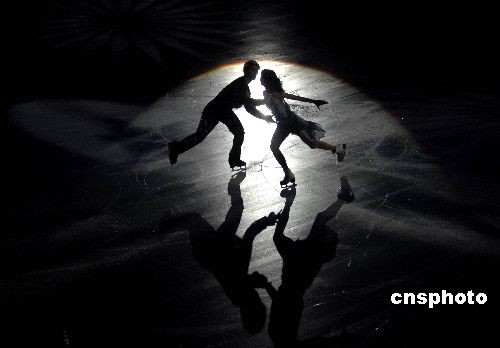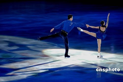 2009年4月12日晚,第十一届全国运动会青岛市赛区组委会在国信体育馆举行了花样滑冰优秀运动员专场表演晚会。获得男、女单人滑、双人滑、冰舞的前四名选手悉数登场,在绚丽多彩的灯光和音乐伴奏下,为观众献上了精彩绝伦的表演。至此,第十一届全国运动会花样滑冰比赛完美谢幕。中新社发 楚天行 摄