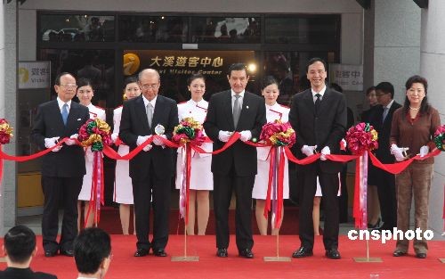 四月十三日,蒋经国百年诞辰纪念日,马英九(左三)在桃园县长朱立伦(右二)陪同下,与蒋经国先生的亲属蒋孝严(左一)、蒋方智怡(右一)来到大溪游客中心,为在这里举办的“经国先生百年诞辰特展”剪彩。中新社发 耿军 摄