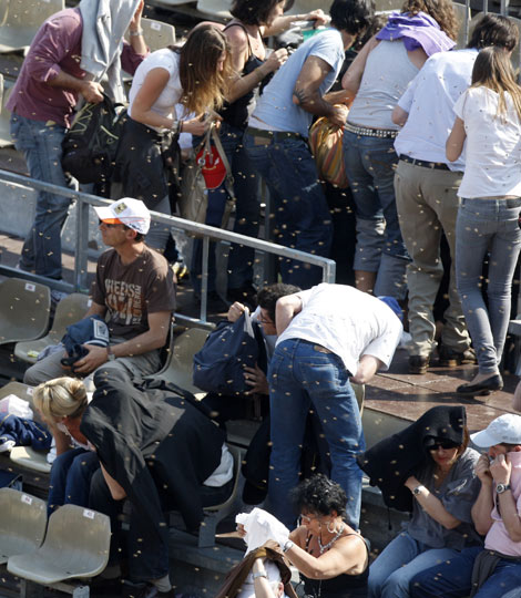 4月13日,在蒙特卡洛网球大师赛上,一群蜜蜂“突袭”了观众席。图为措不及防的球迷们正在逃离观众席躲避蜜蜂的袭击。