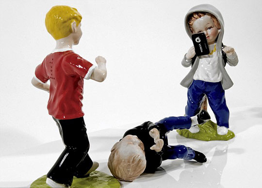 中新网4月15日电 据英国媒体报道,英国一位设计新秀巴福德将廉价的陶瓷小雕像改造成画廊争相收藏的艺术品,用东方趣味陶瓷来展示西方社会现象,其中不乏黑色幽默的嘲讽。