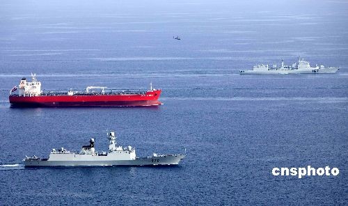 当地时间4月14日下午,中国海军第一批、第二批护航编队共同为第41批商船护航。图为“深圳”舰和“黄山”舰护航情景。中新社发 李唐 摄