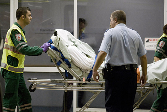 4月16日,在澳大利亚达尔文,一名在爆炸中受伤的难民被运送到医院接受救治。