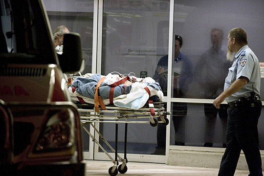 4月16日,在澳大利亚达尔文,一名在爆炸中受伤的难民被运送到医院接受救治。