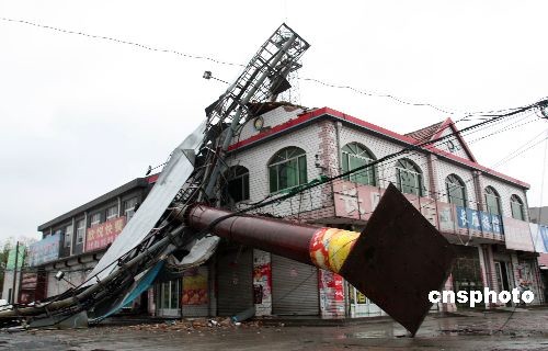4月15日5时许,在803山东省道滨城小营段,一巨型广告牌遭遇大风袭击“倒”在了一旁的居民房上,所幸无人员伤亡。中新社发 郭志华 摄