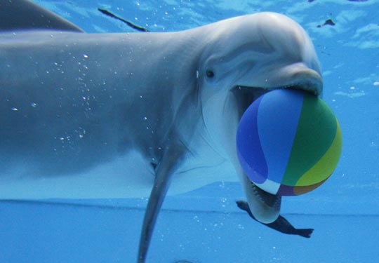 2009年4月16日,在德国南部城市纽伦堡的一家海洋公园里,数只海豚在场馆里玩球嬉戏。