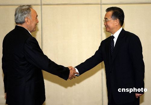 4月17日下午,中国国务院总理温家宝在海南省三亚市亚龙湾,会见前来参加“博鳌亚洲论坛2009年年会”的哈萨克斯坦总统纳扎尔巴耶夫。中新社发 任晨鸣 摄