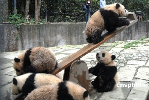 去年“5·12”地震后在四川雅安出生的13只熊猫宝宝,于今年2月12日入住中国保护大熊猫研究中心碧峰峡熊猫幼儿园。如今,熊猫宝宝生活得极其快乐。中新社发 罗小韵 摄