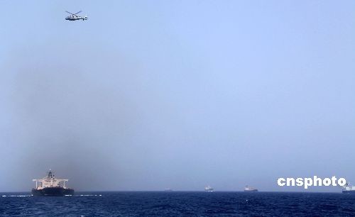 4月16日,中国海军第一、第二批护航编队在亚丁湾海域实施第二次共同护航。图为“深圳”号导弹驱逐舰舰载直升机飞临被护商船上空进行护航巡逻。中新社发 孙自法 摄