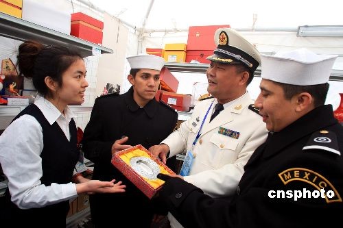 4月19日,来自11个国家的17艘舰艇先后抵达青岛港码头,参加海上阅兵。外国海军官兵对中国举行2008年北京奥运会开幕式的国家体育场“鸟巢”纪念品,产生浓厚兴趣。中新社发 张雷 摄