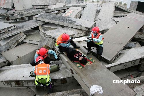 4月23日,北京市红十字会地震灾害救援演练在国家地震局地震灾害救援培训基地展开。此次演练是为纪念四川汶川地震发生一周年,提高市民防灾减灾意识,普及灾害自救互救知识,推进综合减灾能力建设。