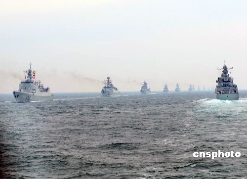 4月23日下午,为纪念中国人民解放军海军成立60周年而举行的海上阅兵在青岛附近黄海海域举行。海上检阅式分两个阶段,第一阶段为海上分列式,检阅中国海军的舰艇和飞机;第二阶段为海上阅兵式,检阅来自14个国家的21艘舰艇。中新社发 宋吉河 摄
