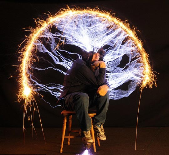 据英国媒体报道,澳大利亚的一位大胆的发明家身穿自制的绝缘服,让50万伏电压穿过他的身体,并且做出了著名雕塑“思想者”的姿态,形成震惊的电击“思想者”。
