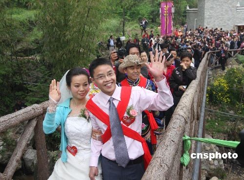 4月26日,四川省北川县政府在擂鼓镇吉娜羌寨为20对“5·12”大地震后重组家庭夫妇举行集体婚礼。