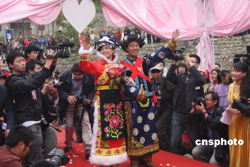 4月26日,四川省北川县政府在擂鼓镇吉娜羌寨为20对“5·12”大地震后重组家庭夫妇举行集体婚礼。