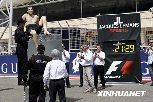 默里尼进行憋气表演后从透明水箱中爬出。