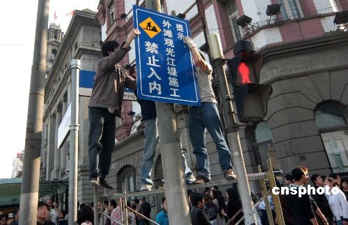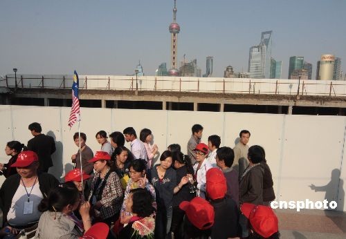 2009年4月26日,为迎接建国60周年和世博会,上海外滩进入封闭施工阶段。游客被围挡在外游览,大型施工机械设施开进工地。中新社发 吴芒子 摄