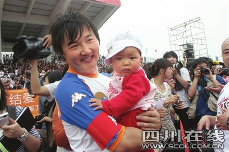 下午5时,义赛结束,现场出现感人一幕:灾区的11个学生,举着写有“灾区学子谢谢您!感恩奋进!”的大牌子来到球场中间,以示谢意。在地震当天出生的10个孩子,与明星们结上帮助对子。