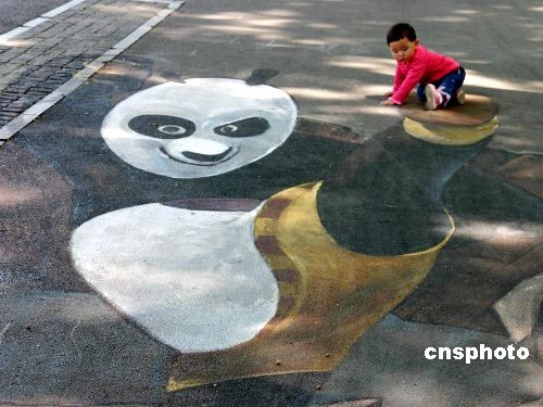 一位小朋友在南京玄武湖公园与“功夫熊猫”留影。中新社发 阿董 摄