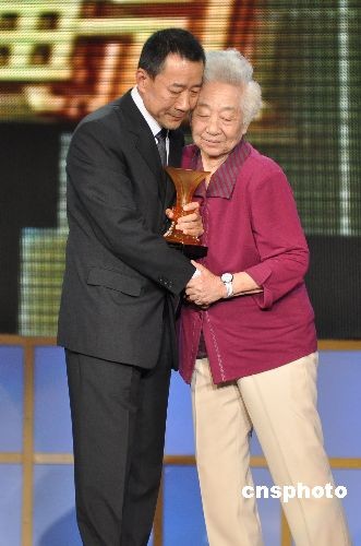 图为李雪健获得“电视电影十年·观众最喜爱的剧情类电视电影男演员奖”,与老艺术家于蓝一起激动落泪。中新社发 李学仕 摄