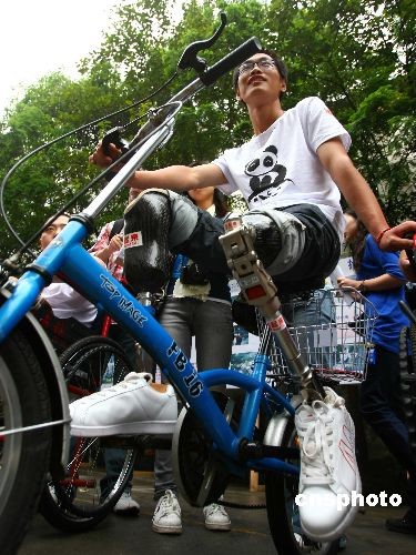 图为年仅19岁的龚桂林在借助假肢骑自行车,在去年汶川大地震中他失去了双腿,医院为他安装了高端假肢。龚桂林现在开始练习轮椅网球,他的梦想就是能参加2012年的残奥会。中新社发 富田 摄