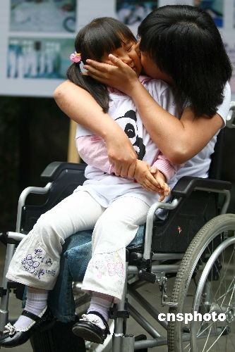 图为一位名叫杨兰的母亲在深情亲吻她3岁半的小女儿王诗琪,这对母女是汶川人,在大地震中女孩的父亲不幸遇难,母亲失去的双腿,在康复中心杨兰得到了全面的治疗。中新社发 富田 摄