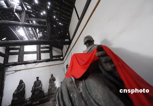 四川大地震重灾区江油县是著名的李白故里,一年前被震坏的李白祠至今被封闭保护。一块红布搭在李白塑像上,等候专业修复。中新社发 贾国荣 摄