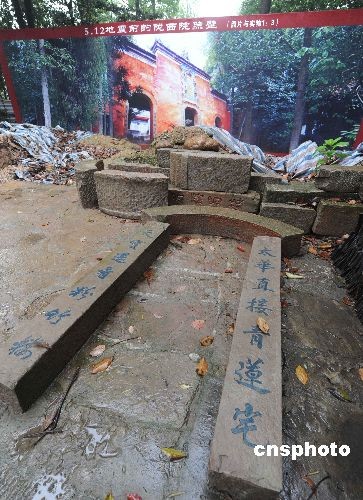 四川大地震重灾区江油县是著名的李白故里,一年前被震坏的李白故居山门古建筑至今被封闭保护,等待专业修复。中新社发 贾国荣 摄