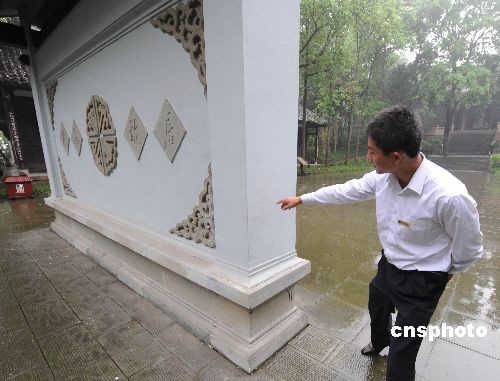 四川大地震重灾区江油县是著名的李白故里,一年前被震裂的李白故居影壁如今已修缮完毕。中新社发 贾国荣 摄