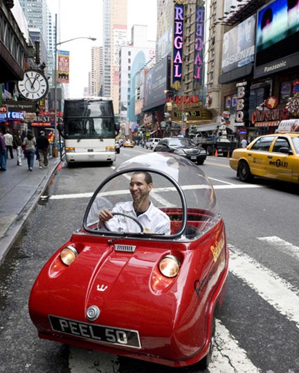 5月7日,一辆由电池驱动的Peel 50迷你汽车在美国纽约时报广场附近亮相。这种汽车的使用是用来缓解纽约的交通堵塞和停车位紧张的状况。