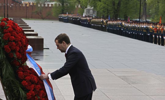 图:梅德韦杰夫向无名烈士墓敬献花圈