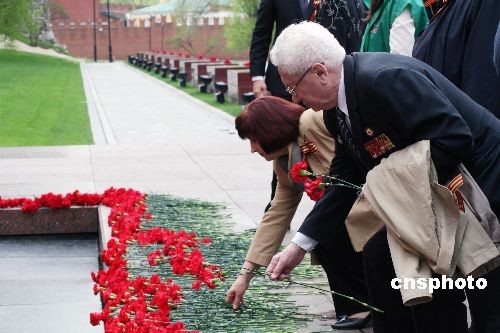 5月8日,莫斯科各界人士向克里姆林宫红墙下的无名烈士墓敬献花圈,纪念卫国战争胜利64周年。中新社发 田冰 摄
