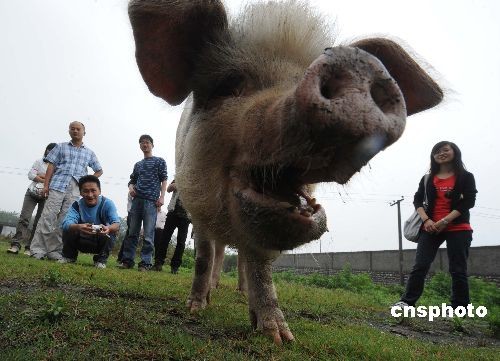 5月8日,去年从地震废墟里救出收养在汶川大地震博物馆的“猪坚强”,由当时瘦得皮包骨头,休养成如今的400多斤。目前它每天散步减肥,准备参加“5.12大地震”一周年大展。中新社发 贾国荣 摄