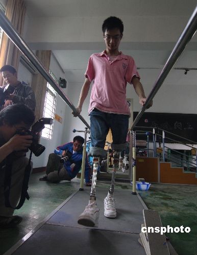 5月8日,北川县北川中学“夹缝男孩”郑海洋在学校康复站进行康复训练。中新社发 郭国权 摄