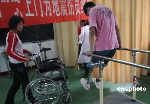 5月8日,北川县北川中学“夹缝男孩”郑海洋在学校康复站进行康复训练。中新社发 郭国权 摄